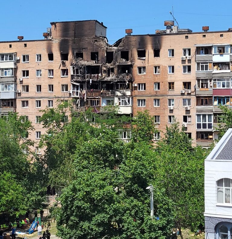 At the foot of the Soviet-era building, debris thrown from various windows of the stairwell accumulates. Around a security perimeter marked by red and white tape, firefighters, police, and soldiers ensure the progress of the work. A crowd of journalists mingles with volunteers preparing wooden planks to cover the windows.