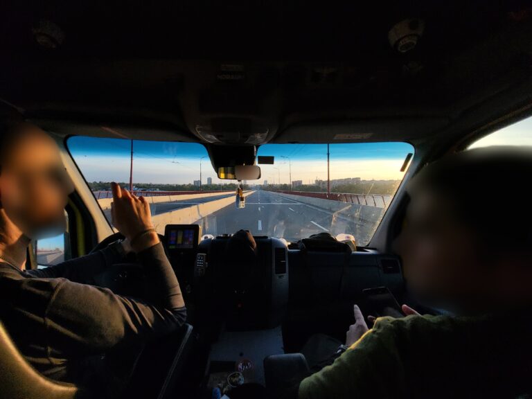 Except for the sound of the ambulance tires that Sasha drives at 120 km/h, calm reigns inside the vehicle. Through the side windows, the landscape brightens, and the sky gradually turns pale blue. It is four in the morning.