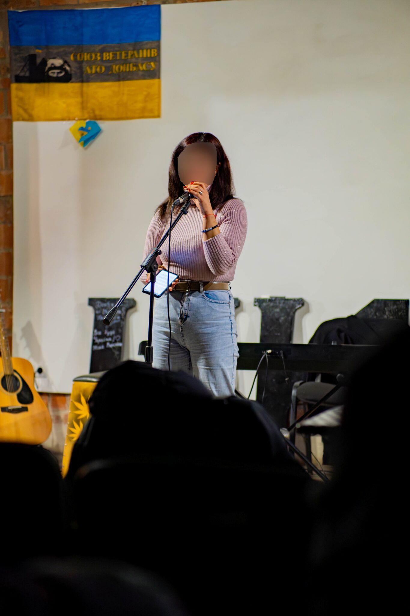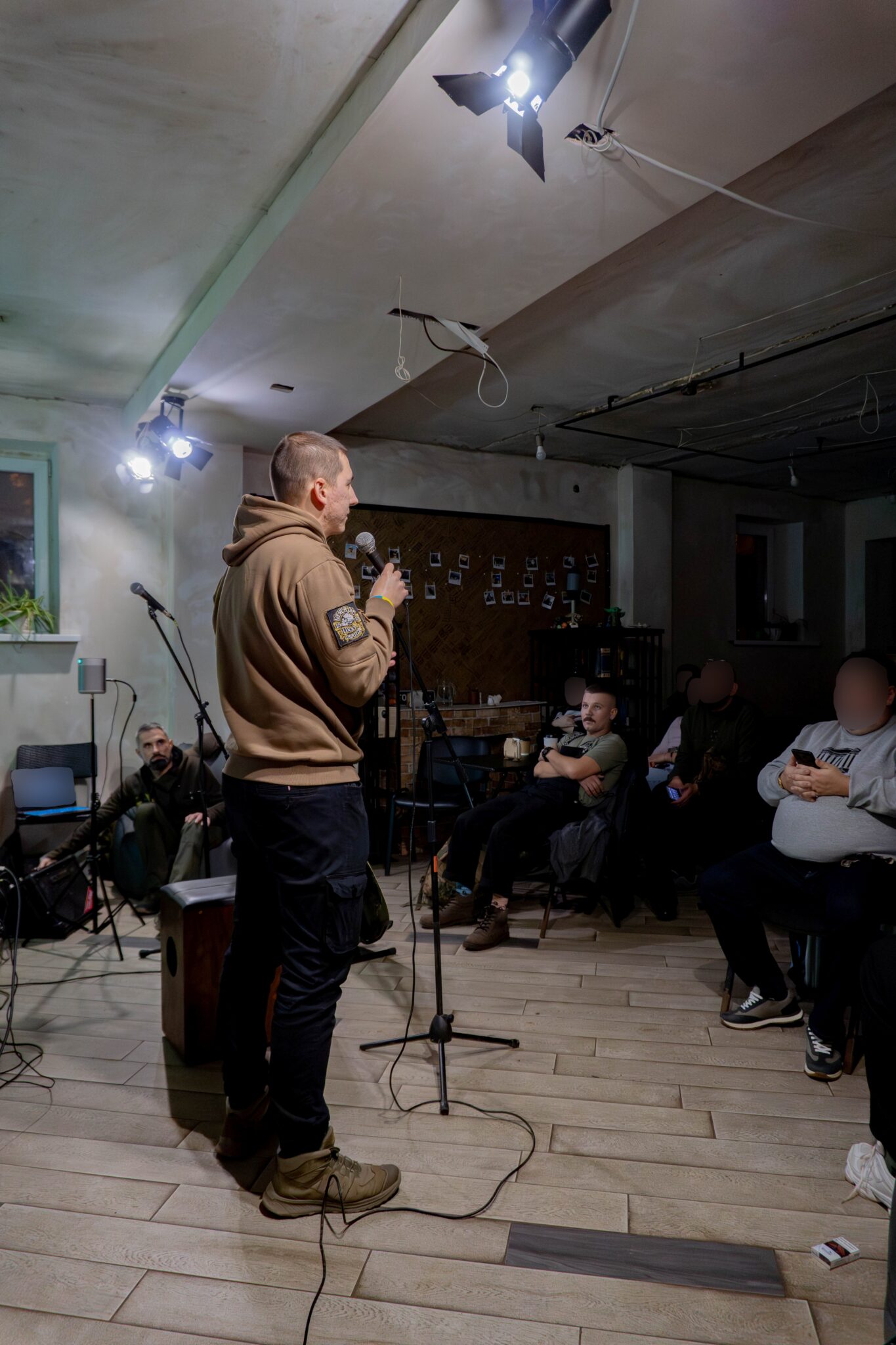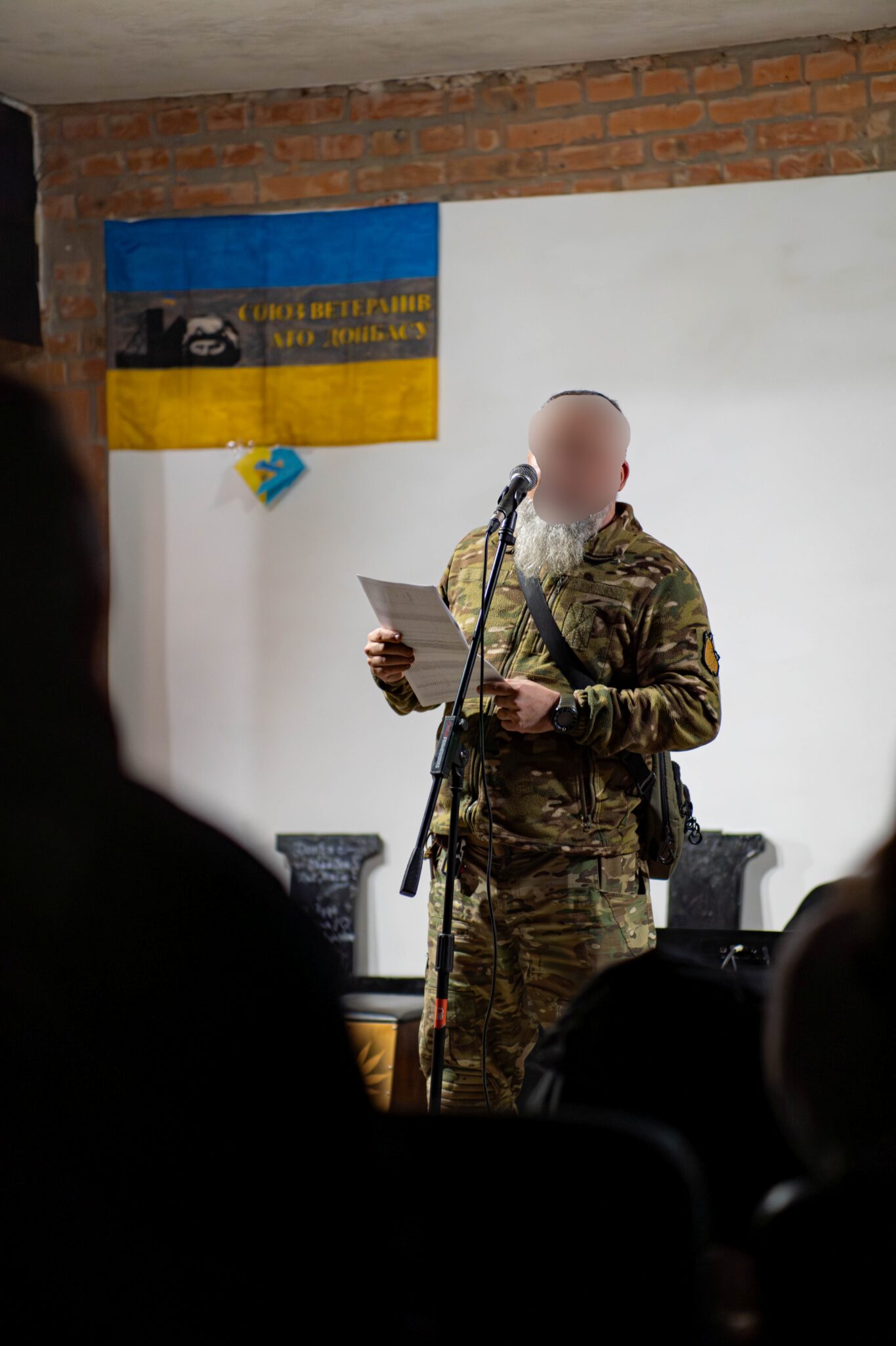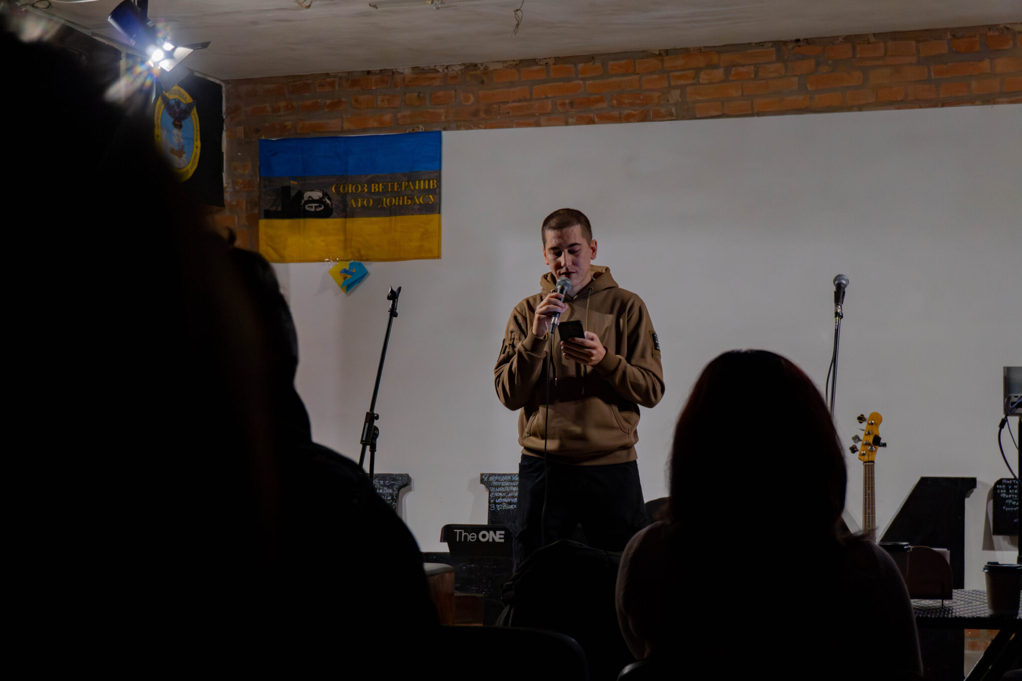“Ok, now, put telephone on airplane mode, OK?” Following the soldiers, we enter the basement of a private establishment. Around thirty civilians and soldiers take their seats in rows. It’s a large gathering in one place; the soldiers worry that so many phones might attract the attention of Russian surveillance drones.